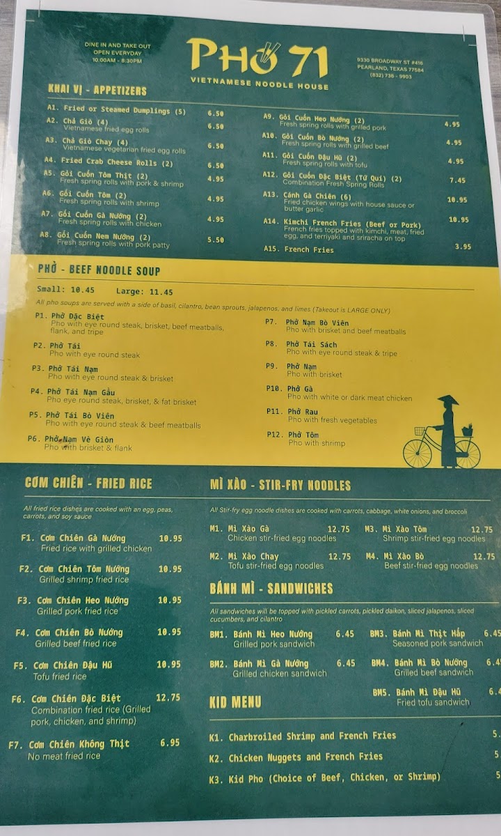 Welcome to Pho 71 - Pearland, where authentic Vietnamese cuisine delights every palate. Located at 9330 Broadway St #416, Pearland, TX, this gem serves a diverse menu that showcases the rich flavors of Vietnam. Signature dishes include Com Tom Nuong, featuring succulent grilled shrimp on steamed rice, and Com Suon Nuong, a grilled bone-in pork chop served with fresh vegetables and pickled carrots.